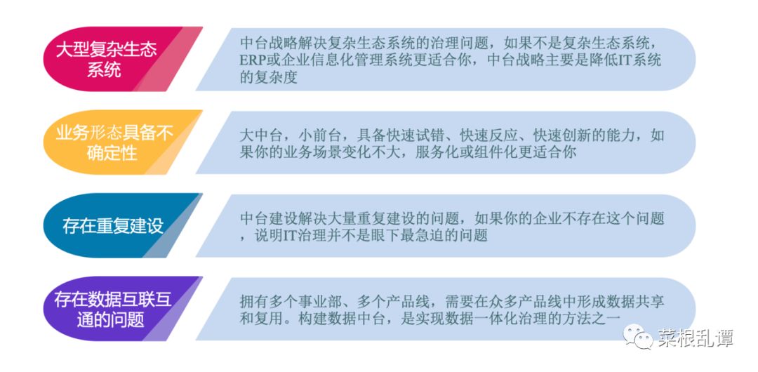 如果企业当前最迫切的诉求是系统繁多但孤岛严重急需要打通,企业已经存在大量的数据急需要在业务上发挥价值,建议数据中台先行。