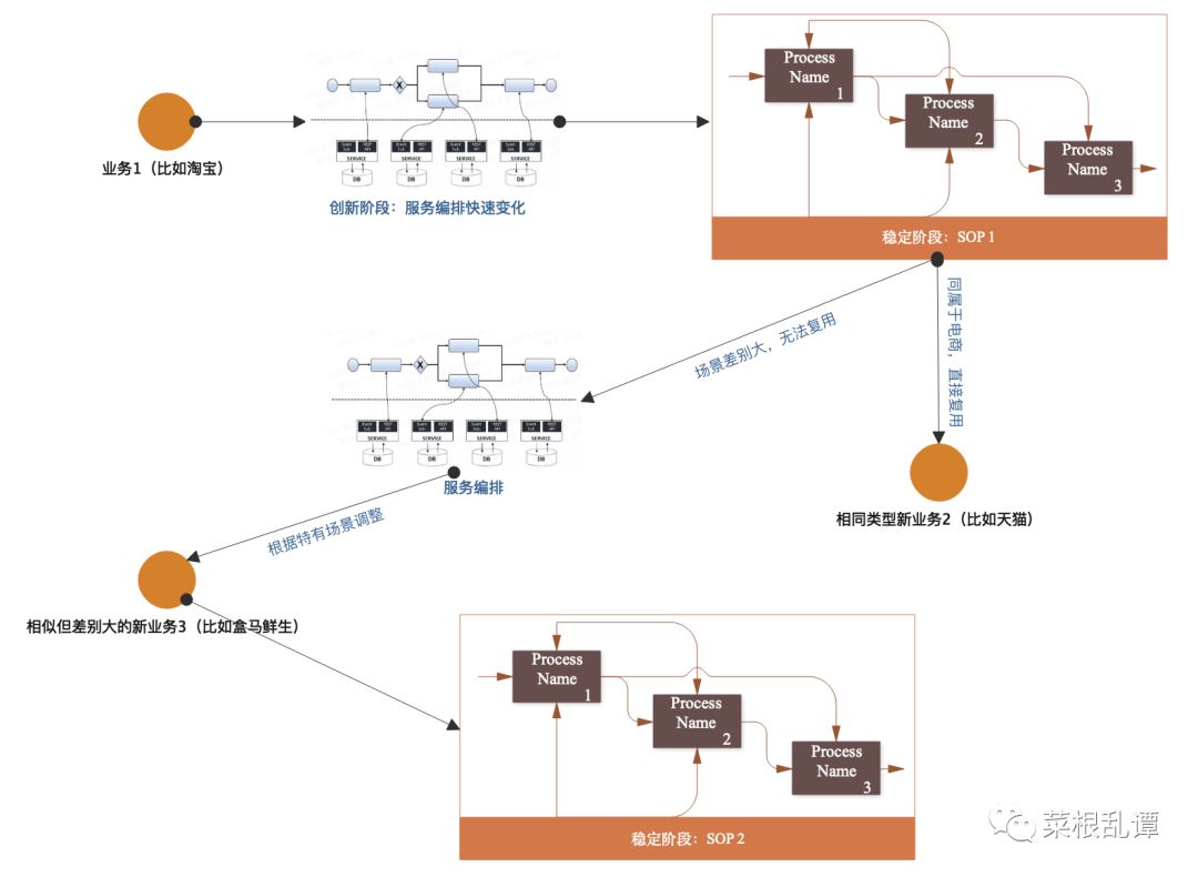 比如淘宝和天猫在业务上可以共享一套 SOP,在这套 SOP 的扩展点上各自注入自己不同的规则,从而满足自己的需求。从中台的复用范围来看,我特别认同这种方式,因为中台只有提供 SOP,才是真正的实现业务流程这种高阶的复用(就像国外 ERP 宣扬的那样,你购买的不只是一套系统,还有企业管理到最佳实践)。
