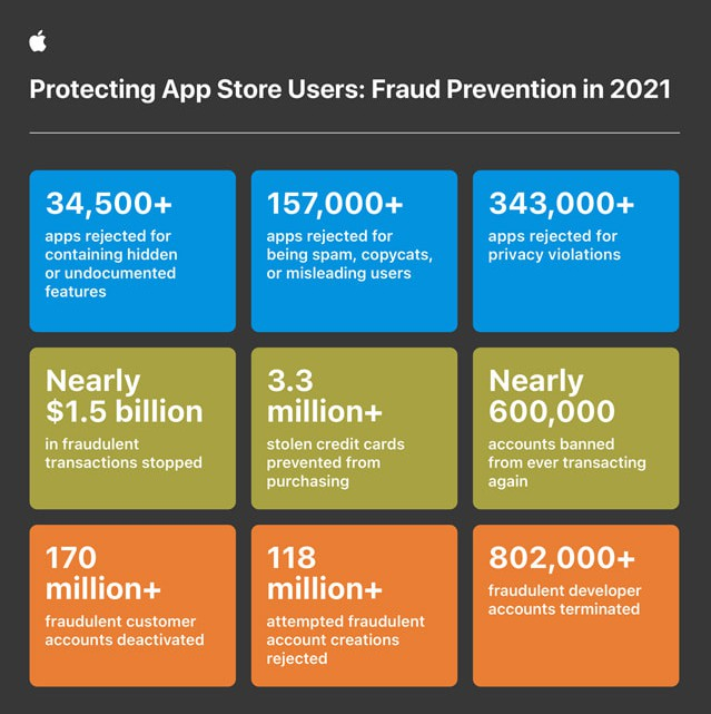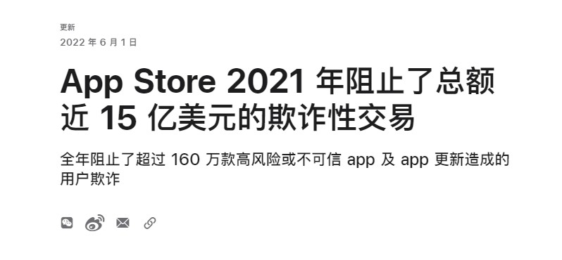 苹果发布了最新的官方报告,报告称 App Store 在 2021 年保护顾客免受总额近 15 亿美元的潜在欺诈交易侵害,阻止了超过 160 万次因高风险或不可信 App 及 App 更新造成的用户欺诈。