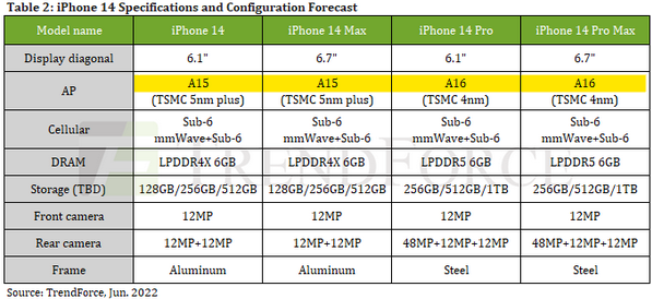据 TrendForce 发布的消息显示,苹果将在 2022 年下半年推出四款 iPhone 14,其中只有 Pro 机型将配备苹果的最新处理器 A16 芯片。值得注意的是,该报告与天风证券苹果产业链分析师郭明錤的信息一致。2022 年 3 月份,郭明錤表示,只有 iPhone 14 Pro 系列机型将配备 A16 芯片,标准版 iPhone 14 将继续配备 A15 芯片。