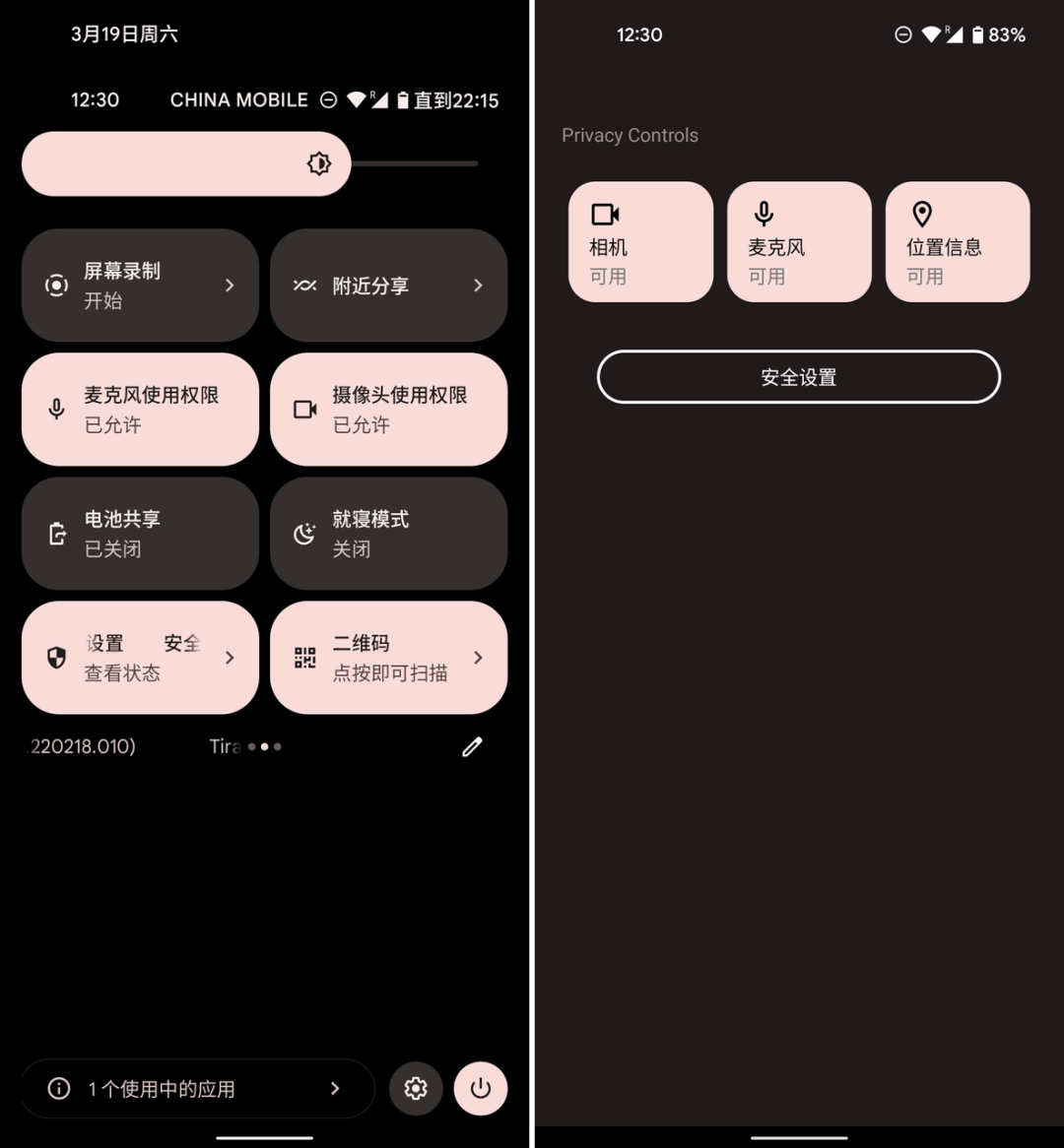 新增了一个名为「安全和隐私设置」的开关,添加后可通过它一键管理相机、麦克风和位置信息的全局开关状态(与已经存在的麦克风、相机全局开关功能有些重复);同时提供一键跳转至系统安全设置界面的入口