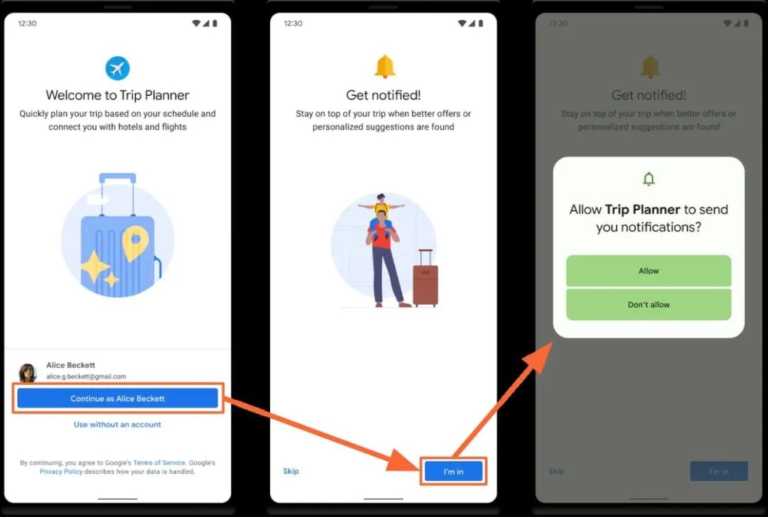 面向 Android 13 进行适配的应用,则可以额外获得更符合实际上下文情境的弹窗时机。比如在应用引导界面中向用户阐明通知用途后,再弹出通知运行时权限授予对话框。