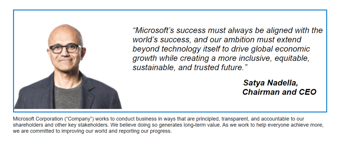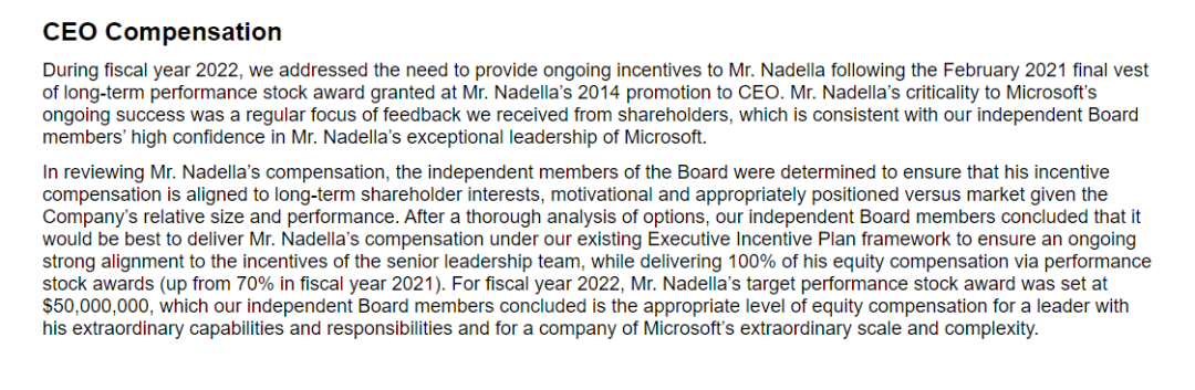 Satya Nadella 和微软的关系也是如此,在微软 2022 年股东签署的委托书上,微软明确表示了“我们设计高管薪酬计划,以吸引、激励和留住推动我们成功和行业领导地位的关键高管,同时考虑个人和公司的绩效以及与股东长期利益的一致性。”