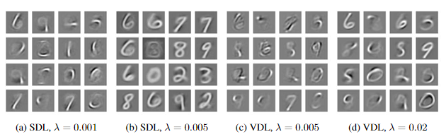 实验结果可以看到,对于两个SDL和两个VDL的字典元素(dictionary elements)来说,在稀疏度λ较低的情况下(0.001, 0.005)解码器似乎可以学到方向、笔划,甚至是是数字图形中的一部分。