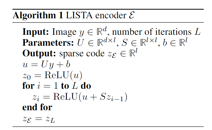 实验中的编码器为一个LISTA(Learned ISTA)编码器,它的设计是为了模仿ISTA推理的输出,类似于一个递归神经网络。编码器由两个全连接层,一个偏置项,以及ReLU激活函数组成。