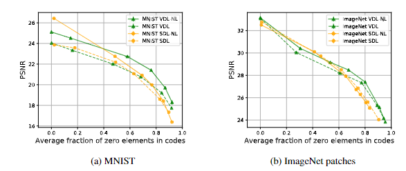 在重构质量上,SDL和VDL模型的编码器的曲线显示了由未激活编码(值为0)成分的平均百分比衡量的稀疏程度和由平均PSNR衡量的重建质量之间的权衡。