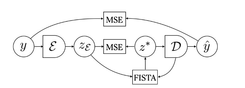 训练过程中,研究人员将编码器E与解码器D同时训练来预测FISTA推理计算的稀疏编码。