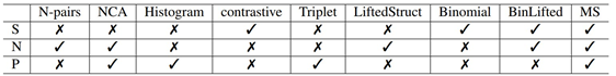原论文表 1:不同损失函数为样本对加权所采用的相似性度量,其中 S、N、P 分别表示自相似性、负相对相似性和正相对相似性。