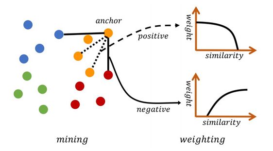 第二阶段的加权则是在采样的基础上进行的,第一阶段采样的样本有正样本(黄色)也有负样本(红色、蓝色),我们需要另外两种相似性来确定它们的重要性。具体而言,如果正样本相似性越高,那么加的权就越少,因为它已经不太需要进一步拉近距离。但如果负样本的相似性太高,就表示它离 anchor 非常近,我们需要提供更大的权重以令模型学会把它们推地更远。