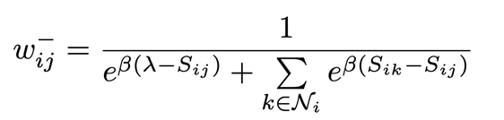 其中 λ-S_ij 表示自相似性,S_ik-S_ij 表示相对相似性,上式将两种相似性结合起来。如果将分母的这两项分开,那么它就和前面两种损失函数非常像。与上式类似,给正样本加权也由这两部分组成。