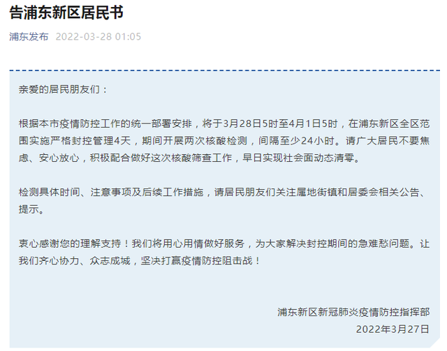 浦东新区新冠肺炎疫情防控指挥部于3月27日wi发布通知称,“根据本市疫情防控工作的统一部署安排,将于3月28日5时至4月1日5时,在浦东新区全区范围实施严格封控管理4天,期间开展两次核酸检测,间隔至少24小时。”