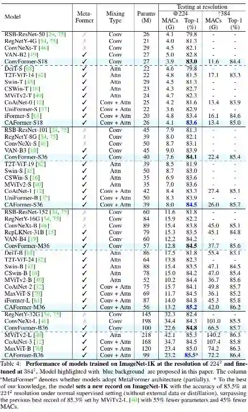 上表给出了ConvFormer、CAFormer与业界其他方案的性能对比,可以看到: