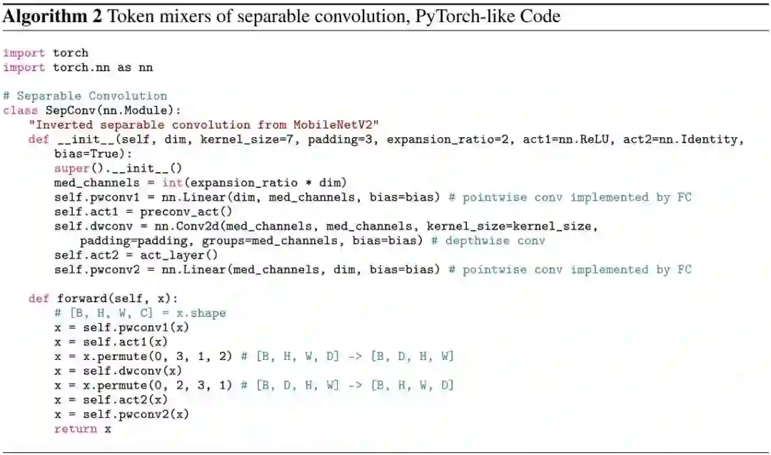 首先登场的是深度分离卷积,作者延续了MobileNetV2的逆分离卷积模块设计,所得模型称之为ConvFormer: