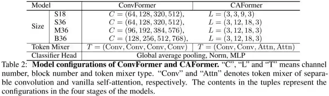 除了卷积外,另一种常见的Mixer为Transformer中的自注意力,它具有更好的全局建模能力,但是会导致较高的计算复杂度。受启发于CoAtNet,作者在前两个阶段使用卷积进行Mixer,后两个阶段使用自注意力,进而构建了CAFormer。关于ConvFormer与CAFormer的参数配置可参考下表。