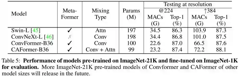 此外,当引入ImageNet21K预训练后,ConvFormer-B36与CAFormer-B36可以进一步提升到87.0%、87.4%(相比ConvNeXt-L,ConvFormer-B36指标高出0.2%且参数量少49%,计算量少34%);当测试分辨率提升到384后,指标还可以进一步提升到87.6%、88.1% 。