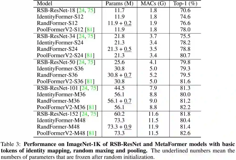 MetaFormer确保了模型的性能下限:当采用Identity作为Mixer时(IdentityFormer)时,取得了>80%的精度;