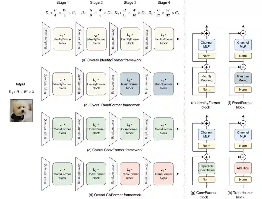 当指定TokenMixer的实现方式后,MetaFormer将演变为特定的模型。正式介绍之前,先来"剧透"一下本文所提到的IdentityFormer、RandomFormer、ConvFormer、CAFormer架构体系。
