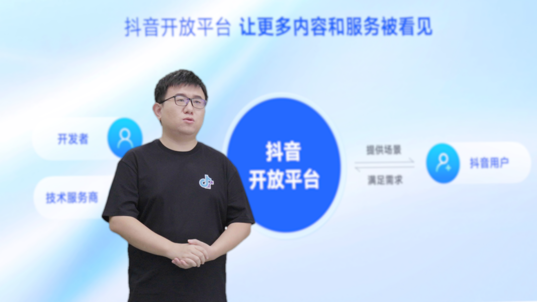 之前大家对于抖音开放平台到底是什么、面向谁、开放什么可能还不是很清晰,在这里我也正式跟大家介绍一下抖音开放平台。抖音开放平台,是基于抖音丰富的产品场景和技术能力,通过能力开放和以小程序为主的应用生态,在合规有序的前提下满足开发者对于在抖音上获客-留存-转化-复访-促活过程中的个性化经营需求,为抖音用户提供更加丰富多元的服务、商品和信息。