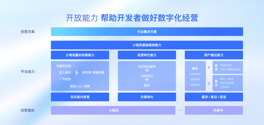 抖音开放平台以小程序+抖音号为经营载体,对外开放了小程序基础框架能力、公域流量挂载能力、经营转化能力和用户触达能力,全面为经营者提供了从抖音内获客,到交易转化到最后用户留存/复访促活的内容营销场景和玩法。同时平台提供了以小程序为主的行业解决方案,帮助开发者在抖音实现数字化营销。