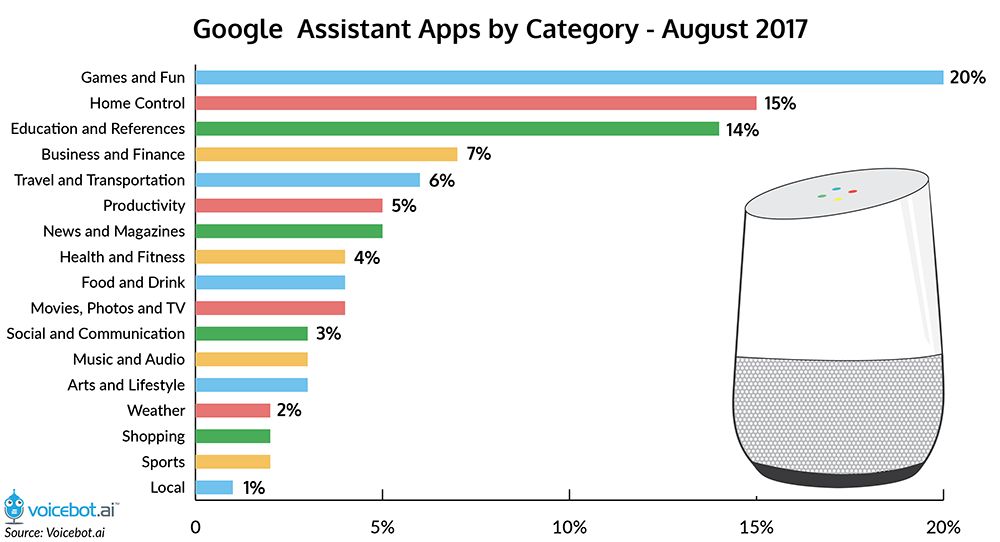 再回头看Google assitant的skill,大部分集中在productivity和utility上:今天天气怎么样?帮我读一条新闻等等。