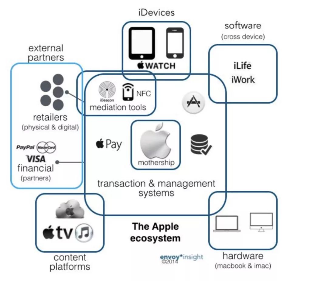 所以,锁定在苹果的生态中,是很聪明的做法。看一下iOS的生态系统图就知道了,苹果最大的优势是iOS+iPhone的双星闪耀。最好的硬件吸引人们购买,最好的软件锁定和留存用户。