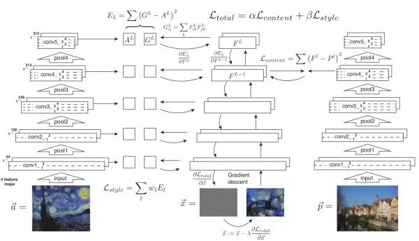风格迁移基本思路 优化目标包括两项,使生成图像的内容接近原始图像内容,及使生成图像风格接近给定风格。风格通过Gram矩阵体现,而内容则直接通过神经元激活值体现。