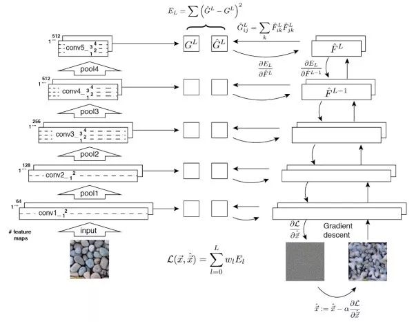 纹理生成基本思路 对给定纹理图案的Gram矩阵进行特征逆向工程。使生成图像的各层特征的Gram矩阵接近给定纹理图像的各层Gram。低层特征倾向于捕获细节信息,而高层特征可以捕获更大面积的特征。