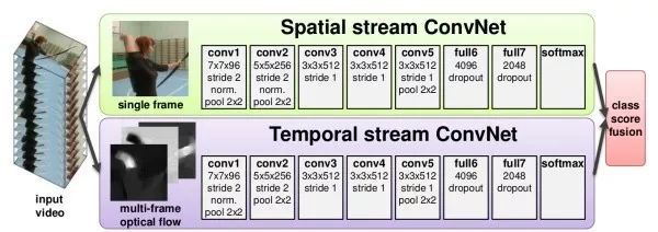 图像+时序两分支结构 这类方法用两个独立的网络分别捕获视频中的图像信息和随时间运动信息。其中,图像信息从单帧静止图像中得到,是经典的图像分类问题。运动信息则通过光流(optical flow)得到,其捕获了目标在相邻帧之间的运动情况。