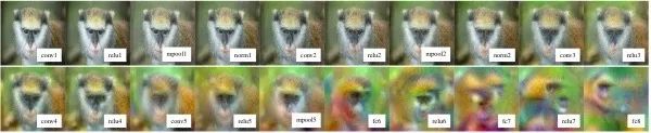 特征逆向工程(feature inversion) 这两类问题的基本思路。给定一个中间层特征,我们希望通过迭代优化,产生一个特征和给定特征接近的图像。此外,特征逆向工程也可以告诉我们中间层特征中蕴含了多少图像中信息。可以看出,低层的特征中几乎没有损失图像信息,而高层尤其是全连接特征会丢失大部分的细节信息。从另一方面讲,高层特征对图像的颜色和纹理变化更不敏感。