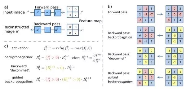 输入显著性图 对给定输入图像,计算某一特定神经元对输入图像的偏导数。其表达了输入图像不同像素对该神经元响应的影响,即输入图像的不同像素的变化会带来怎样的神经元响应值的变化。Guided backprop只反向传播正的梯度值,即只关注对神经元正向的影响,这会产生比标准反向传播更好的可视化效果。