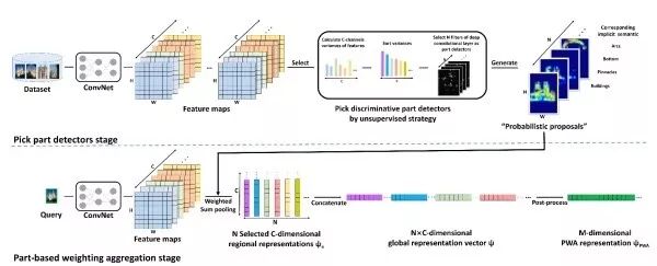 PWA PWA发现,深度卷积特征的不同通道对应于目标不同部位的响应。因此,PWA选取一系列有判别能力的特征图,将其归一化之后的结果作为空间权重进行汇合,并将其结果级联起来作为最终图像表示。