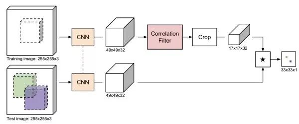 CFNet 相关滤波通过训练一个线性模板来区分图像区域和它周围区域,利用傅里叶变换,相关滤波有十分高效的实现。CFNet结合离线训练的孪生网络和在线更新的相关滤波模块,提升轻量级网络的跟踪性能。