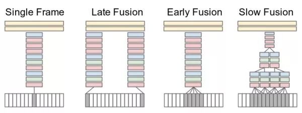 多帧图像特征汇合 这类方法将视频看成一系列帧的图像组合。网络同时接收属于一个视频片段的若干帧图像(例如15帧),并分别提取其深度特征,之后融合这些图像特征得到该视频片段的特征,最后进行分类。实验发现,使用"slow fusion"效果最好。此外,独立使用单帧图像进行分类即可得到很有竞争力的结果,这说明单帧图像已经包含很多的信息。