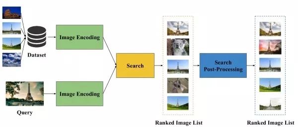 图像检索的典型流程 首先,设法从图像中提取一个合适的图像的表示向量。其次,对这些表示向量用欧式距离或余弦距离进行最近邻搜索以找到相似的图像。最后,可以使用一些后处理技术对检索结果进行微调。可以看出,决定一个图像检索算法性能的关键在于提取的图像表示的好坏。