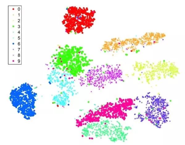t-SNE 对图像的fc7或pool5特征进行低维嵌入,比如降维到2维使得可以在二维平面画出。具有相近语义信息的图像应该在t-SNE结果中距离相近。和PCA不同的是,t-SNE是一种非线性降维方法,保留了局部之间的距离。下图是直接对MNIST原始图像进行t-SNE的结果。可以看出,MNIST是比较容易的数据集,属于不同类别的图像聚类十分明显。