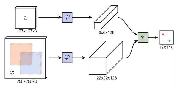 孪生网络 类似于人脸验证的思路,利用孪生网络,一支输入第一帧包围盒内图像,另一支输入其他帧的候选图像区域,输出两张图的相似度。我们不需要遍历其他帧的所有可能的候选区域,利用全卷积网络,我们只需要前馈整张图像一次。通过互相关操作(卷积),得到二维的响应图,其中最大响应位置确定了需要预测的包围盒位置。基于孪生网络的方法速度快,能处理任意大小的图像。
