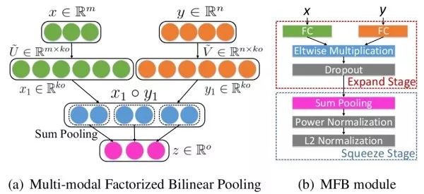双线性融合 通过视觉特征向量和文本特征向量的外积,可以捕获这两个模态特征各维之间的交互关系。为避免显式计算高维双线性汇合结果,细粒度识别中的精简双线性汇合思想也可用于视觉问答。例如,MFB采用了低秩近似思路,并同时使用了视觉和文本注意力机制。