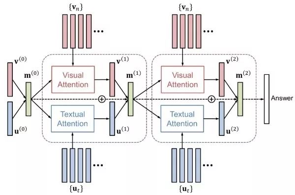 注意力机制 和“看图说话”相似,使用注意力机制也会提升视觉问答的性能。注意力机制包括视觉注意力(“看哪里”)和文本注意力(“关注哪个词”)两者。HieCoAtten可同时或交替产生视觉和文本注意力。DAN将视觉和文本的注意力结果映射到一个相同的空间,并据此同时产生下一步的视觉和文本注意力。