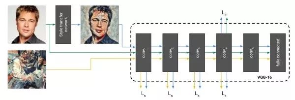 直接生成风格迁移的图像 上述方法的缺点是需要多次迭代才能收敛。该工作提出的解决方案是训练一个神经网络来直接生成风格迁移的图像。一旦训练结束,进行风格迁移只需前馈网络一次,十分高效。在训练时,将生成图像、原始图像、风格图像三者前馈一固定网络以提取不同层特征用于计算损失函数。