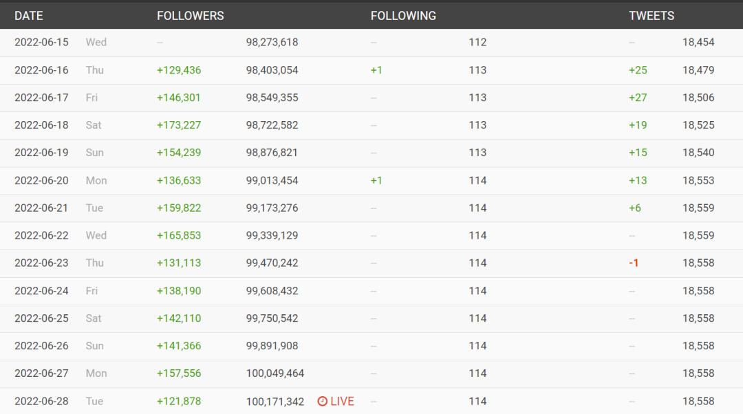 据推流数据监测站Social Blade显示,马斯克在推特上「跨过」1亿粉丝大关的时间,其实是26日到27日之间。最近两周,每日涨粉的数量在15万左右,总体趋势比较平稳。