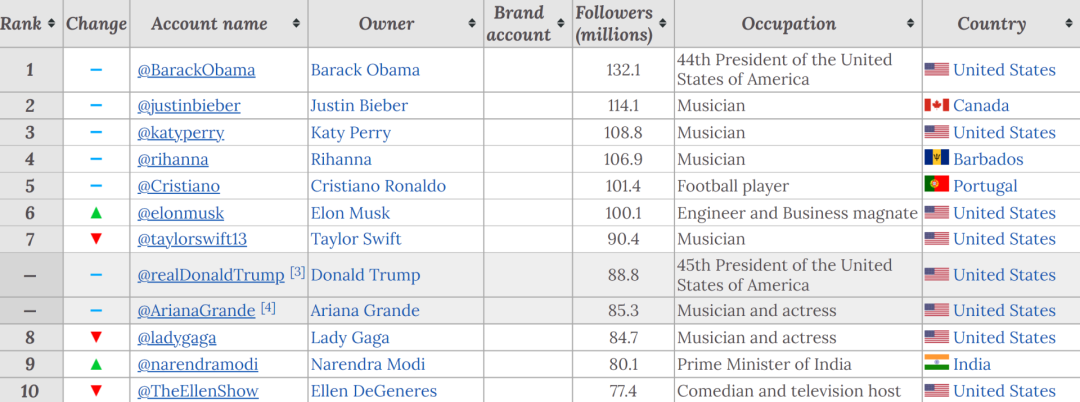 在推特粉丝Top10榜单上,目前排在马斯克前面的有:美国前总统奥巴马、加拿大小鲜肉贾斯丁·比伯、「水果姐」Katy Perry、著名音乐人蕾哈娜、足球巨星C罗。