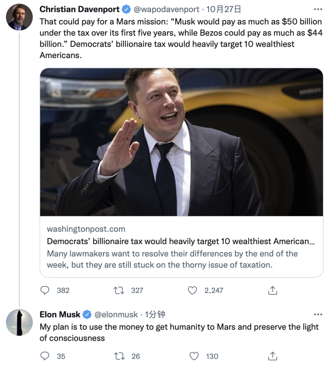 「与其交500亿税,我打算用这笔钱送人类去火星上,保留认知之光」。
