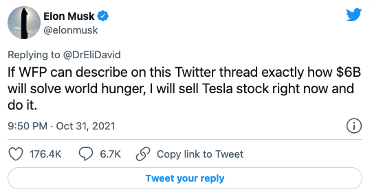 比如前一段时间,联合国世界粮食计划署(WFP)主任找上马斯克,直接开口就要60亿美元,说是能解决全球贫困人口的吃饭问题。