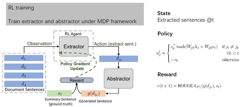 这篇论文对摘要的处理跟前面提到的两篇做摘要的论文稍有不同,但也是很经典的做法:先从文本中抽取片段,再通过片段生成摘要。其实此类框架很多,但这篇论文尝试将这两个分开的步骤通过强化学习的方式统一到了一起,倒是跟上一节的 R3 有几分相像。抽取部分和生成部分用的都是 state-of-art 的方法:前者是基于pointer-net,后者是 pointer-generator,在这里就不展开讲了。