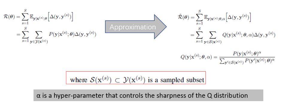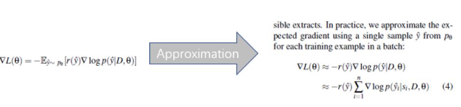 跟 MRT 一样,这里同样会面临状态空间太大的问题,比如当输入文本有 N 句话时,对应的抽取可能性有 2^N 种,虽然不及前面提到的N^T 来的大,但也是个不小的量级,同样需要抽样,只不过跟 MRT 里的抽样略有不同,这里是根据每种抽样的概率排序,然后抽取K 个最大可能的情形,作为新的状态子空间。抽样完毕后,便可以改造梯度下降(摘自本人课件)