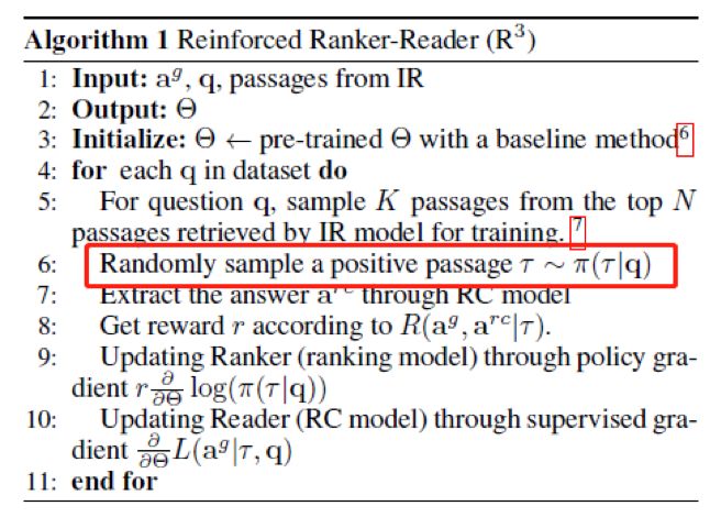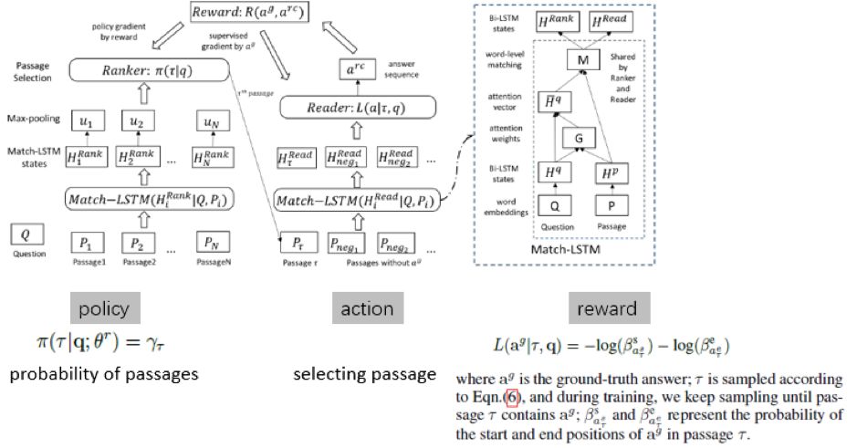 『策略』就是 Ranker 出来的篇章的概率分布,采取的动作则是挑选文章,反馈是预测出的答案片段起始位置的打分