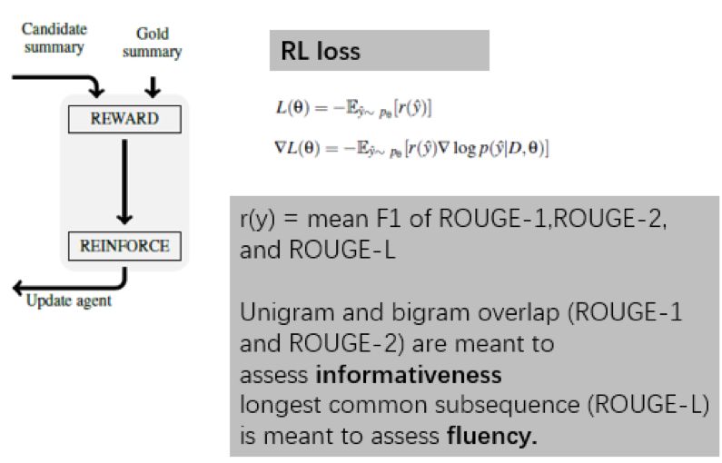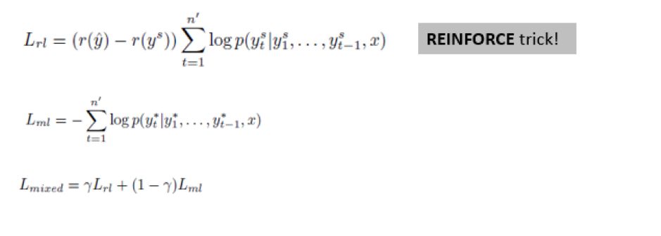 该论文的精髓,跟 MRT 类似,即通过强化学习的方法改造损失函数,加入跟评价指标相关的项,如下所示(摘自本人课件)