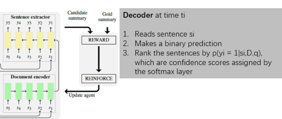 解码过程则比较自然,从大的框架看,输入是 CNN 编码后的所有句子,输出这句话是摘要的概率。具体到实现上,又是 rnn 形式,初始输入是encoder出来的向量,第 i步的输入对应第 i 个句子的 embedding,如下所示(摘自本人课件)