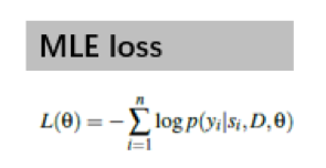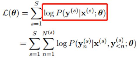 这里的 S 是训练样本总数,红框里就是由传统的极大似然估计得到的交叉熵损失函数,每一步预测出的单词yn 都会跟标准答案计算出损失值,然后在所有时间步上求和。