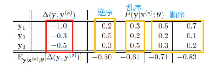 传统loss项和新加的项,正好可以看成 a 和 b 这俩数列的某两项ai 和 bj,假设我们这里的 Y 是所有序列 y 的集合,则 新加项的取值是跟模型无关的评价指标值,是固定的,而传统 loss 项的取值是变化的。所以为了使整个目标项的取值最大,就需要传统 loss 项,也就是 P(y|x) 的取值,跟评价指标一致。文中也给出了一个表格,佐证了这个观点,我从数列角度做了标注,如下
